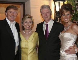 Hillary Clinton happily joined Donald Trump and Melania Knauss in Florida in 2005 to celebrate their marriage but now she is vying with him to be President of the United States of America, the wannabe Democrat candidate made her twit of herself by trying to claim she just attended to witness a bit of “entertainment”.
