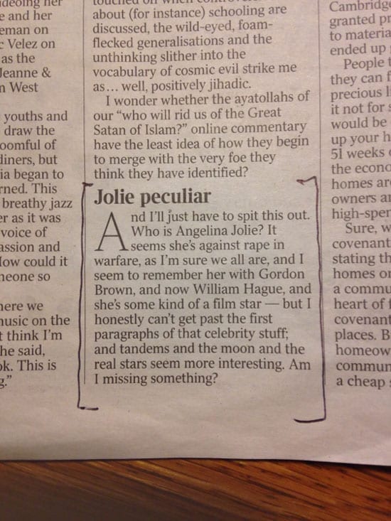 “Who is Angelina Jolie?” Matthew Parris feels obliged to “spit this out” in an article in The Times. Thus with his opening sentence he conveys only too clearly his contempt for this international movie star who has raised her voice in the defence of women who are not only savagely raped, but killed as just punishment to the poor losers. The victors would call it the spoils of war. “It seems”, he writes with just the slightest hint of sarcasm, that she’s against rapes in warfare as I’m sure we all are. Yes, we all are Mr Parris but whereas your small voice would hardly raise a ripple in the ocean of the world’s injustices, her voice and face will carry around the globe and give comfort and succour to millions. “Am I missing something?” you write with such faux innocence. Indeed you are. Conscience perhaps?