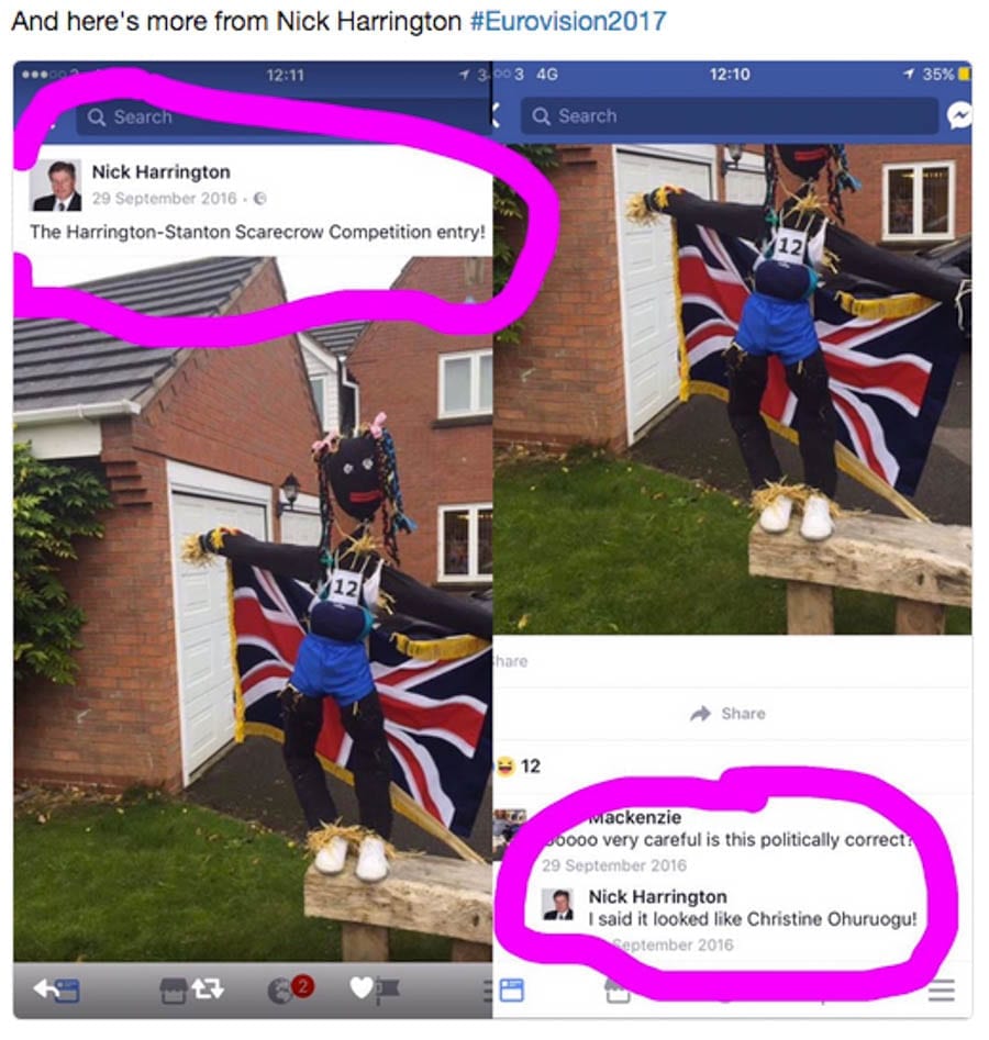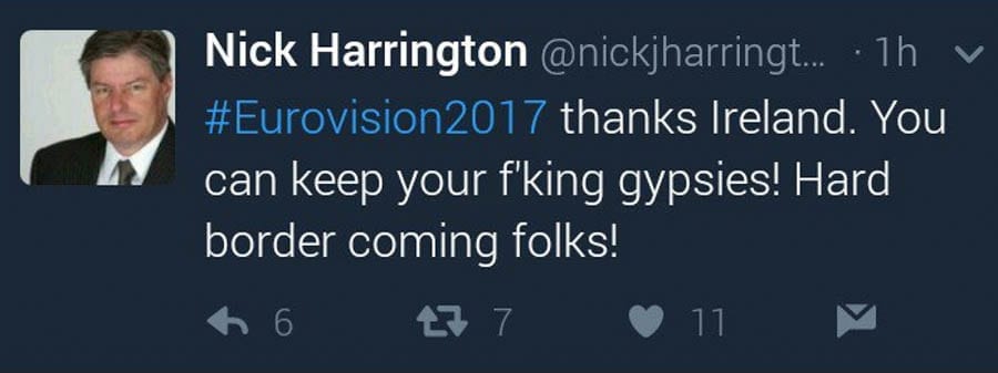 Racist Tory councillor Nick Harrington tweeted: “You can keep your f***ing gypsies” after Ireland gave Britain ‘nul points’ in the 2017 Eurovision Song Contest. The bigot, magistrate and director of Ambay Software Ltd. then added: “Hard border coming folks!” but showed no remorse when contacted at his £400,000 home in Weston-under-Wetherley, near Leamington Spa, Warwickshire. Though Harrington was subsequently suspended by the Conservative Party and has now taken his Twitter account down, other social media users subsequently exposed previously highly inappropriate posts that this vile shocker had made elsewhere .