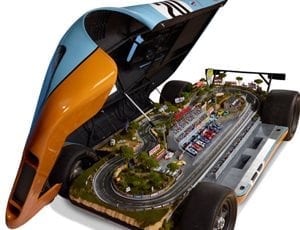 Now, fans can play out their own version of it in their own homes by purchasing a replica fibreglass Porsche 917 that has been converted into a 1:32 scale, wooden slot car racetrack complete with 12 limited edition slot cars.