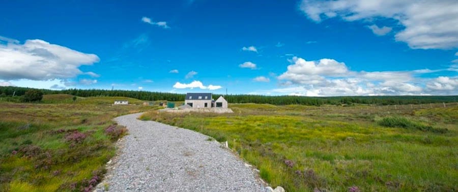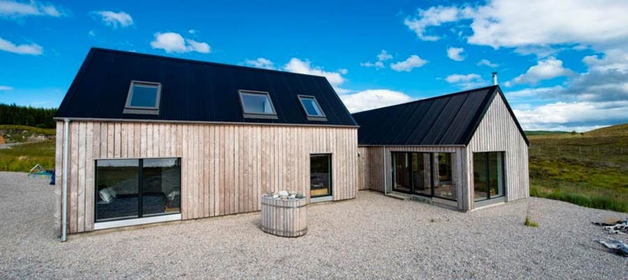 Constructed with larch cladding and a black painted sinusoidal roof, this entirely off-grid house has solar panels that feed a generator for electricity. Water comes from a bore hole and with 168 acres of land with fishing rights for brown trout, deer stalking and shooting rights, there is the possibility to live completely sustainably.