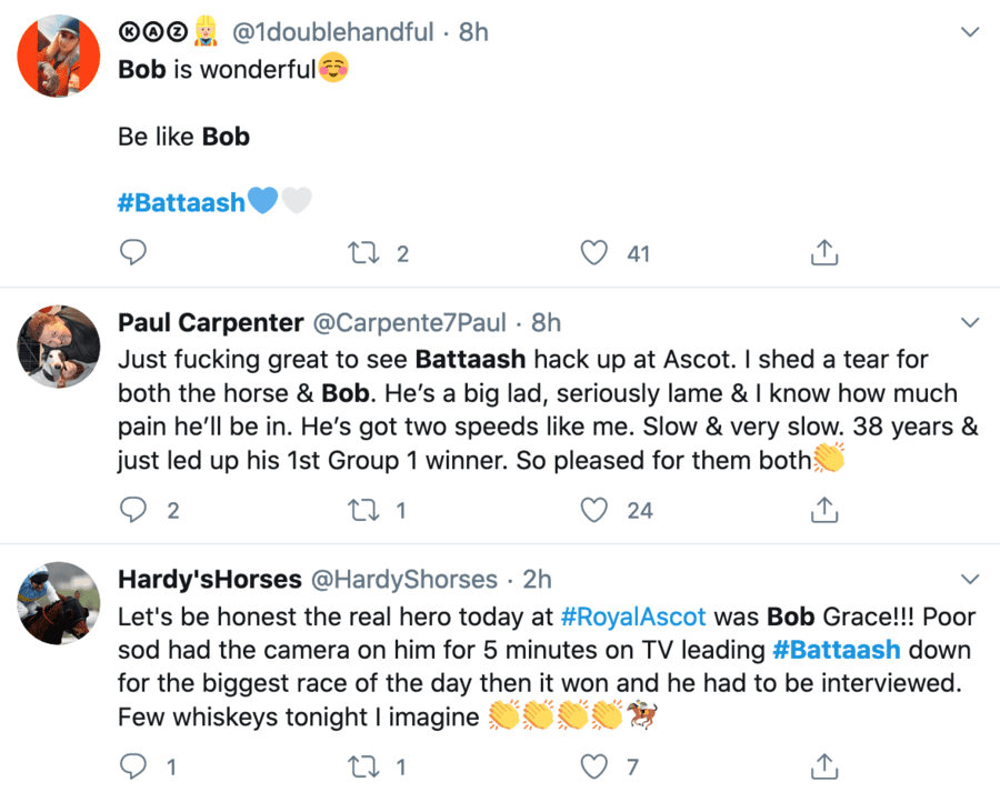 In his humble response to his first win after 38 years of racing at Royal Ascot, winning groom Bob Grace provided much needed cheer to racing fans everywhere along with his trusty companion Battaash