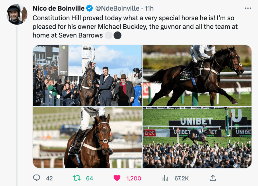 Pictured Top – Nico de Boinville on Constitution Hill after his victory in the Champion Hurdle on Tuesday 14th March 2023.