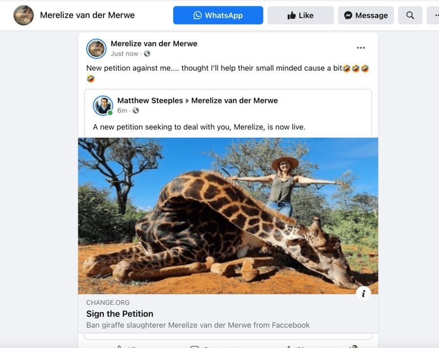 Join the 4,000+ individuals who’ve signed our Change.org petition to get the giraffe slaughterer Merelize van der Merwe banned from Facebook by clicking here.