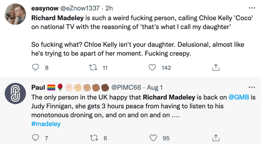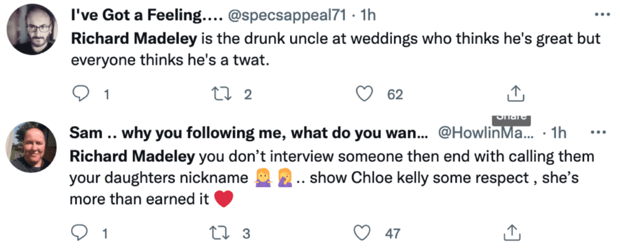 Madeley is reliable at being annoying and like the fictional character he bases himself upon, Alan Partridge, he’s someone who doesn’t realise that people are laughing at him and not with him. Here is a berk of the first order and here is a prized prat who this morning decided to insult one of England’s winning ‘lionesses,’ a lady named Chloe Kelly.