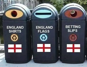 England’s woefully hopeless efforts are summed up best in an image sent to us by reader Peter Burrell that just had to be our Picture of the Week. In it are three recycling bins baring the captions “England shirts”, “England flags” and “betting slips”.