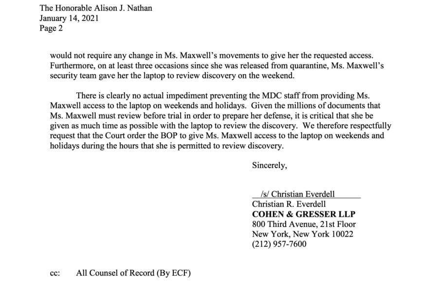 Yesterday, having previously moaned about her not having a desk, writing surface or email access in August 2020, her lawyer, Christian R. Everdell of Cohen & Gresser LLP, wrote to The Honourable Alison J. Nathan to demand “the Bureau of Prisons give Ms. Maxwell access to the laptop computer [which has more than generously already been made available to her 5 days per week] provided by the government so that she can review discovery on weekends and holidays.”