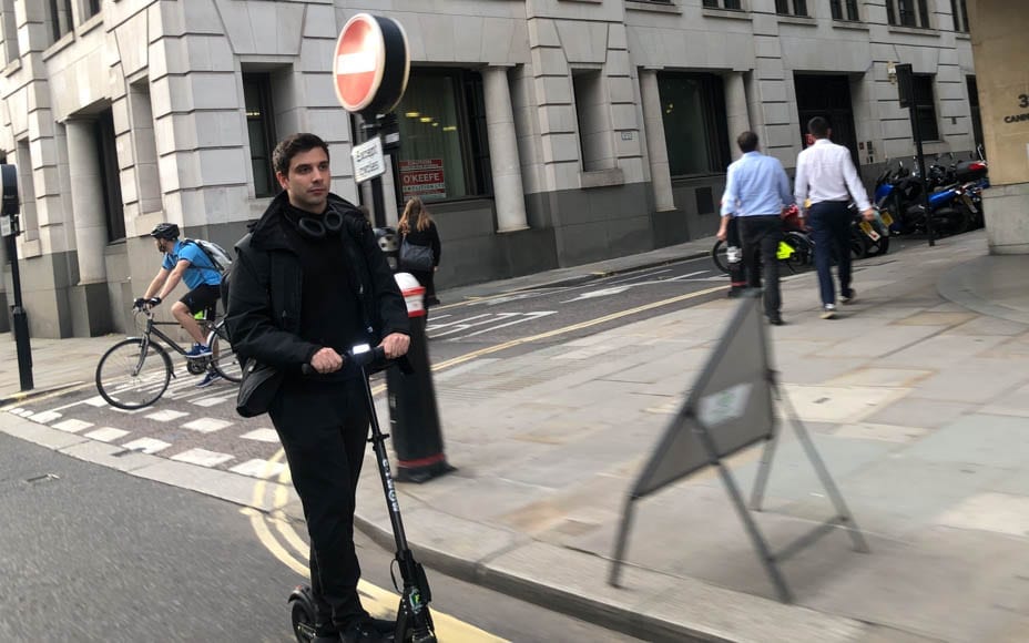 Riding an electric scooter on the road is forbidden in the UK at present. Nor are they allowed on the pavement.