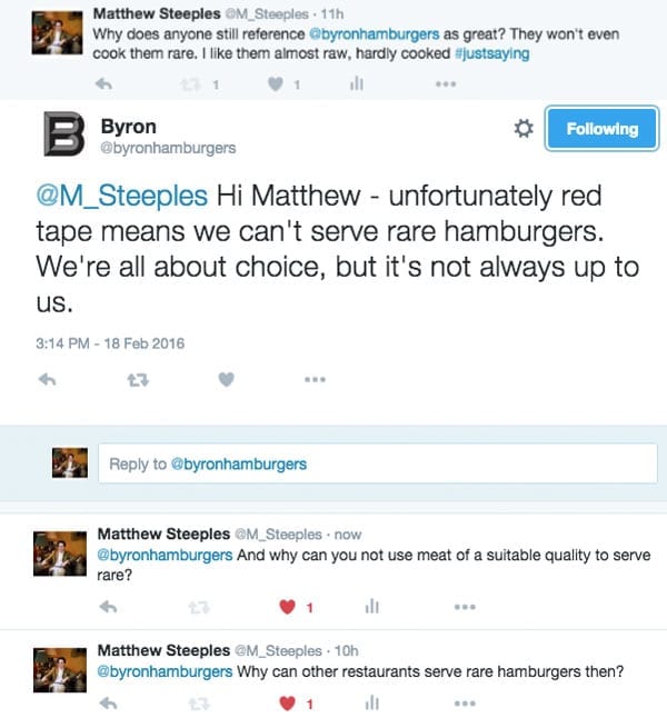 In response to a tweet that asked: “Why does anyone still reference @byronhamburgers as great? They won’t even cook them rare. I like almost raw, hardly cooked. #justsaying”, the firm answered: