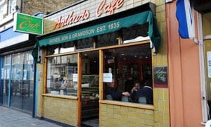 The oldest cafe in the Kingsland Road, Arthur’s itself attracts a wide and varied clientele of builders, locals and old ladies. The actor Ade, who appeared in Guy Ritchie’s Snatch, is often to be spotted here and others include the businessman Stephen Annett, who ventures over from Kensington for breakfast from time to time. Arthur welcomes all with a cheery smile and his family, equally, are hospitable in the extreme.