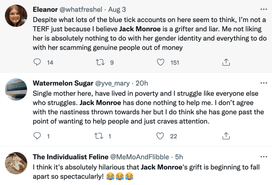 Monroe is a relentless grifter and shamelessly playing on all her (alleged) oppression points. She’s awful, and I especially think this having been genuinely, crushingly impoverished for years. I actually had to go steal sanitary products, toilet paper, went through skips for food and clothing bins. That’s rough when your peers are wearing nice clothes and eating decent dinners, never worrying about leaving lights on.