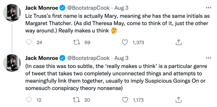 The busybody-bore was called out for her “public scrounging” via her “grifting beg of a blog” on social media after she truly made a prized prat of her anything-but-sorry-self. Here is a person who truly gets the goat of so many and unsurprisingly so.“You are NOT on the poverty line” raged one Twitter user who added: “Too lazy to get a 9 to 5. Rattling your tip jar to accept other peoples’ generosity which could be going to people who actually need it.” Another pointedly added: “Got a spare £500? Give it to Jack Monroe; she is destitute despite her book deal, TV work and newspaper columns. Her work raising the plight of non-binary folk living off 3p beans is immeasurable. I’ve a lot of time for her and she is a role model to all who grift for a living.”The patronising pest Monroe told her Twitter followers via her @BoostrapCook account that: “It’s a play on a classic – cacio e pepe – literally pasta, pepper and cheese. If you have the means to cook dried pasta from scratch (hob, pan, fuel, colander, physical ability) then good for you, but not everybody does. Snobbish miserable gatekeeping does nothing to help anyone.” She then unhelpfully added: “If you’d prefer my recipe for Torta di Gorgonzola semifreddo with desiccated black olive crumb, I can dig it out. I – can – do the fancy ridiculous stuff too; I just choose not to make that the main focus of my work in favour of the less glamorous ‘making sure people can eat.’” Shame on this ridiculous ranting ratbag.The bombastic bore then turned her attention to examining Liz Truss’s name and banged on about Margaret Thatcher and Theresa May also. Jack Monroe as a conspiracy theorist is one thing, but Miss Marple she most certainly ain’t.