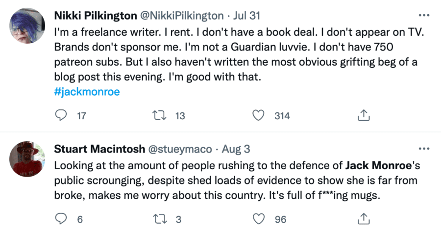 Mouthy moron and all-round maniac Jack Monroe has sponsorship deals left, right and bloody centre. This person of confused identity makes a packet from such, yet takes it upon ‘itself’ to claim to be the voice of those living on the breadline.