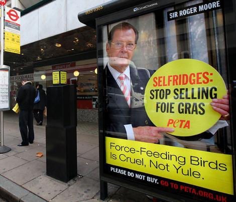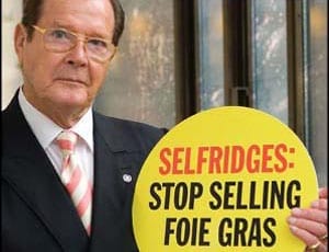 The production of Foie Gras is cruelty personified and anyone’s desire to celebrity-bash should not overlook it. Just because rich people eat it in England, does not mean that it is a small-scale industry world-wide. I saw a video of intensively farmed foie gras geese… (or ducks; I forget which, but the breed of bird is irrelevant) a few weeks ago, before the publication of this Roger Moore story. The birds had food PUMPED into their stomachs by a man holding them by their necks. Some birds apparently have their throats ruptured in the process. All birds were grossly fat and unable to walk, to such a degree that rats were nibbling at open wounds on their bodies. Maybe this is the same video that R.M. refers to? There is no kind way of producing free range foie gras, as no animal overeats to the point of disease in natural circumstances. Yes Roger Moore should perhaps widen the remit of this campaign, but lets get the majority here on board first!