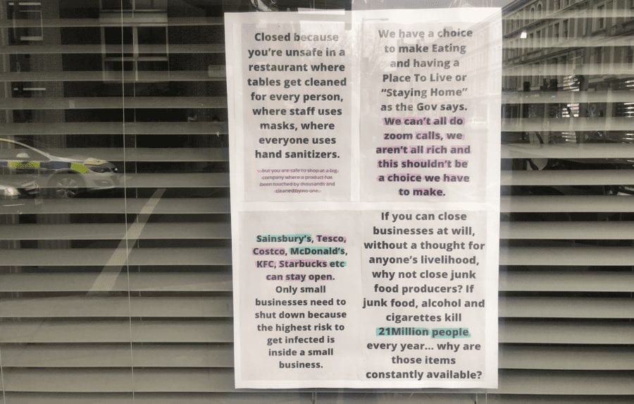 Echoing our sentiments last September when ‘Bosie The Clown’ brought in his stupid 10pm bar, pub and restaurant curfew, hardworking Jonny Lekaj has decided to put a number of posters in his windows slamming the blanket closure of restaurants nationwide as an “attack on small businesses.”