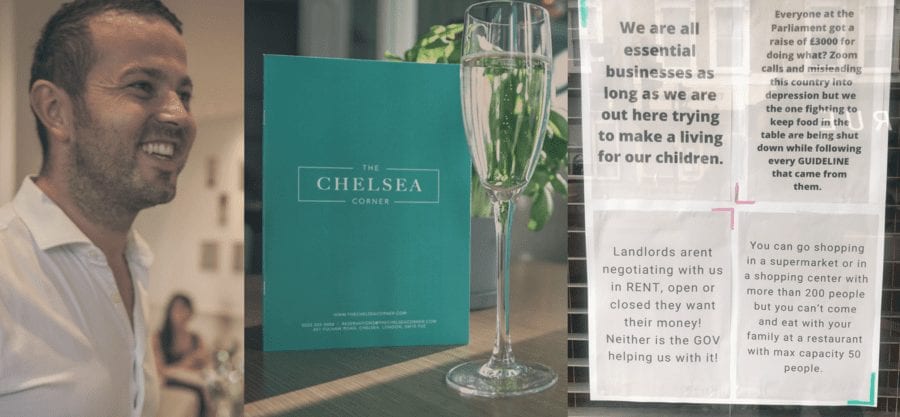Management of Fulham Road Italian The Chelsea Corner share their anger at the British government with protest posters against Lockup 3.0 and restaurants being branded “non-essential”