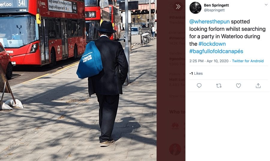 Looking as disheveled as ever, an image of this washed-up wastrel was shared on social media by one Ben Springett. In the picture, normally ‘any party, anywhere’ Pun appeared next to a bus “looking forlorn whilst searching for a party in Waterloo” along with a swag bag he’d “liberated” from the London Art Fair and the hashtags #lockdown #bagfullofoldcanapes.
