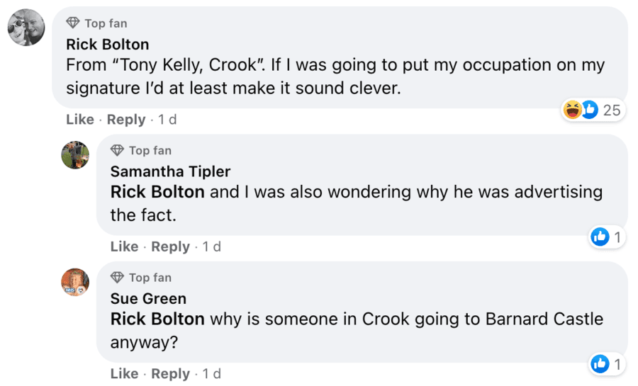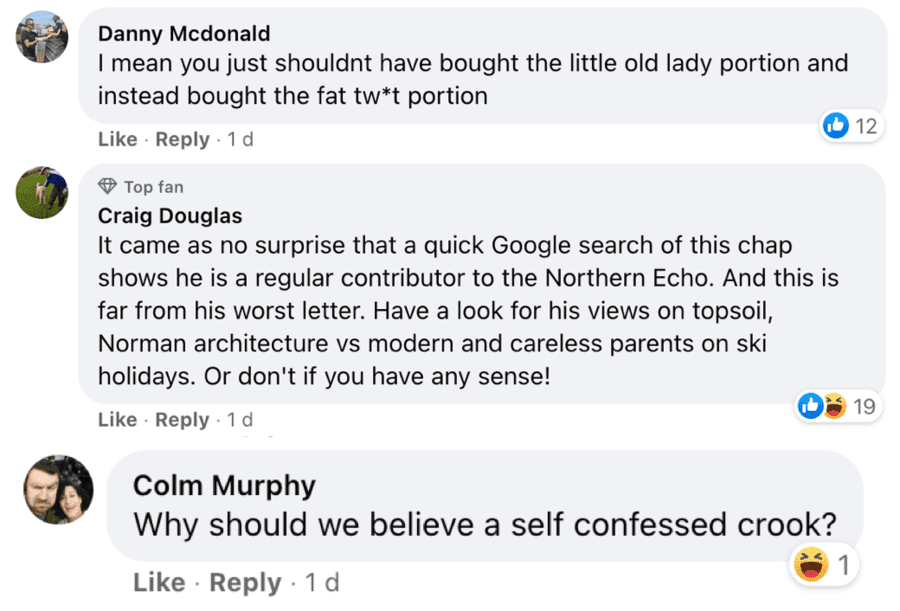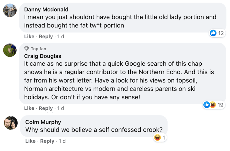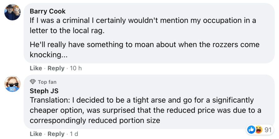 Featured in the Angry People in Local Newspapers group on Facebook, one Tony Kelly of Crook, County Durham wrote to The Northern Echo to bleat about what he termed “so-called ‘pensioners’ portions’” of fish and chips last week.