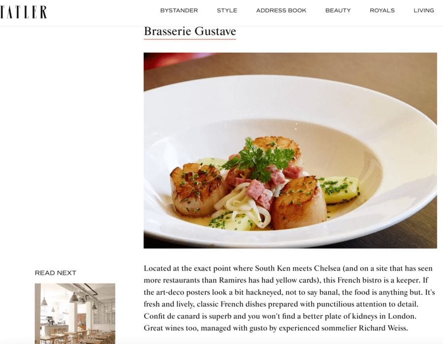 Whilst of their thirteen selections, the loathed by Dan Wootton magazine prattled: “We’ve eaten our way around Chelsea’s top restaurants… We’ve got you covered,” a comment on OpenTable from as long ago 22nd August 2016 reads: “I made a reservation and got there and the restaurant was closed.” Plainly, anyone with half a brain would have realised five years ago that Brasserie Gustave turned out actually to be anything but “a keeper.”